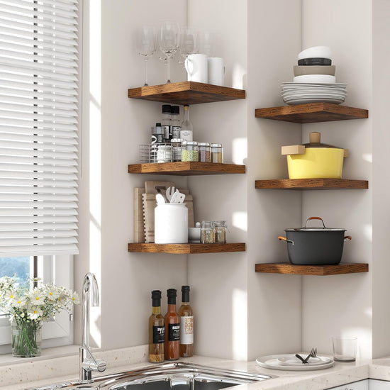 【Wall Decor & Extra Storage】: The minimalist design of the floating shelves adds contemporary style to the home. A set of three panels can be placed on the wall, either high or low, or mounted side-by-side to create a clean, streamlined look that enhances the beauty of the décor. Not only that, wood shelves can create instant open storage in a small home or add character to a large room.